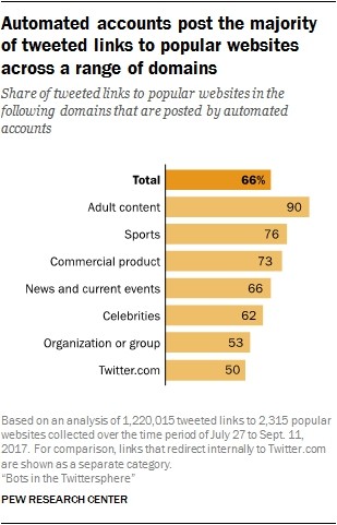 I ricercatori hanno creato una lista di 2315 siti popolari, analizzando per sei settimane 1,2 milioni di tweet contenenti link ai siti stessi: ebbene, il 66 per cento di questi tweet viene condiviso dai bot. In altre parole, 2 tweet su 3 sono gestiti direttamente da macchine, evidenziando il “ruolo pervasivo che gli account automatici hanno nel diffondere link ad una vasta gamma di importanti siti su Twitter”.